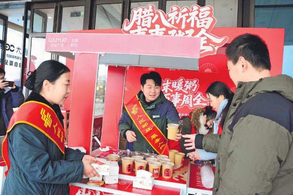 1月26日,江苏省射阳县邮政分公司联合共建单位——中联社区、吾悦广场置业公司,在吾悦广场开展“腊八祈福,事事粥全”活动,免费向快递小哥、出租车驾驶员、环卫工作者等500多名群众送上可口的腊八粥和面巾纸,并向他们送上节日祝福,让节日的温暖在街头巷尾流淌。