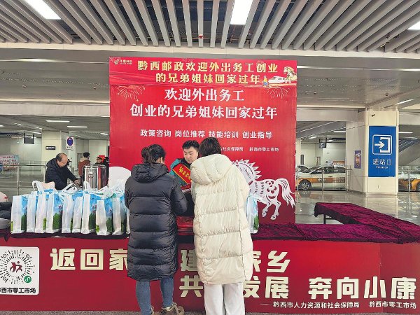 2月2日,贵州省黔西市邮政分公司联合人社部门,在高铁站为返乡人员提供暖心服务。 □肖亚 摄
