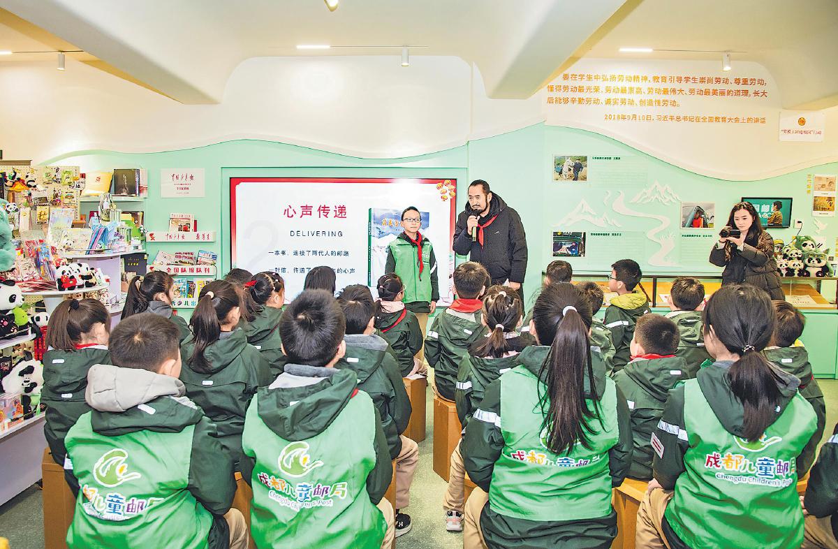 成都儿童邮局名誉局长其美多吉和小朋友们交流。 □曾祥文 摄
